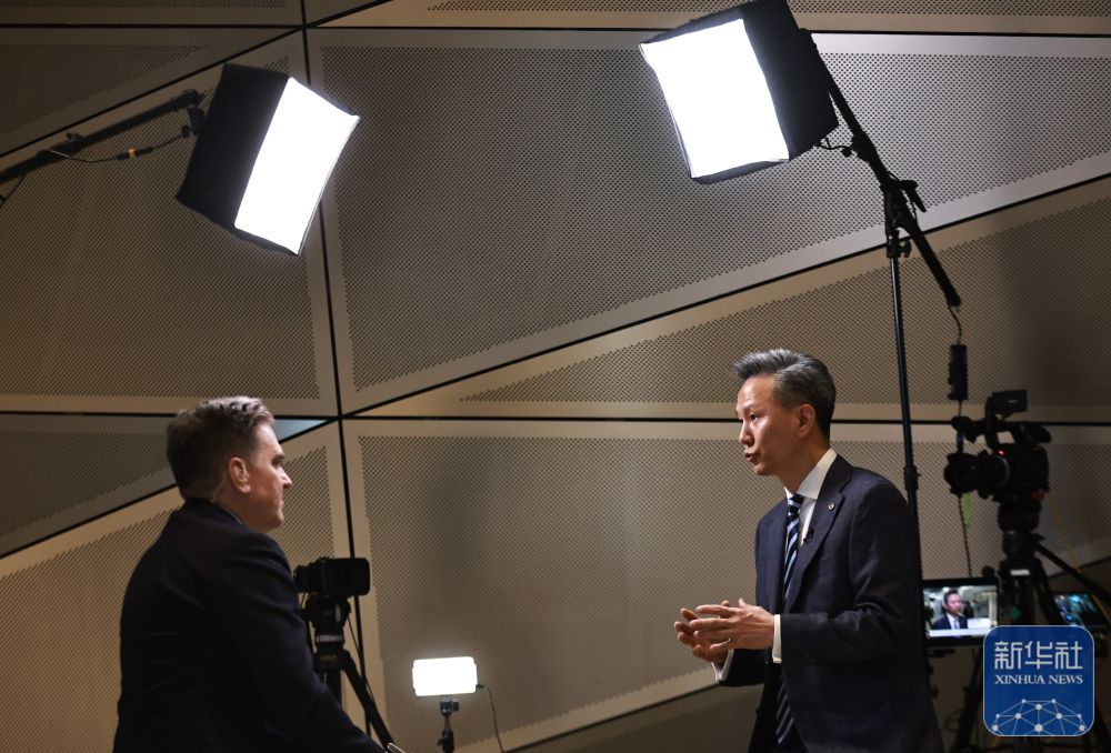 ↑ 6月25日,一位參會嘉賓接受媒體采訪。