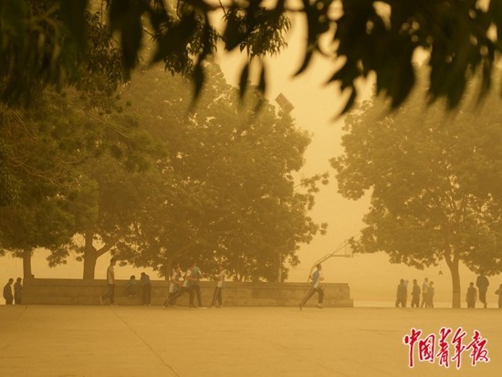 這時(shí)候,學(xué)生們?nèi)哉驹诓賵?chǎng)上說(shuō)話(huà),上課鈴響了,才慢慢踱回樓里。學(xué)校外面,路邊的人就坐在沙霧里吃燒烤,出租車(chē)大敞著窗戶(hù)載客,騎電動(dòng)車(chē)的人偶爾瞇起眼睛,沙子打得臉疼,也絕不戴口罩。之后,人們像掃雪一樣,耐心地掃去門(mén)口、窗臺(tái)上的沙土。