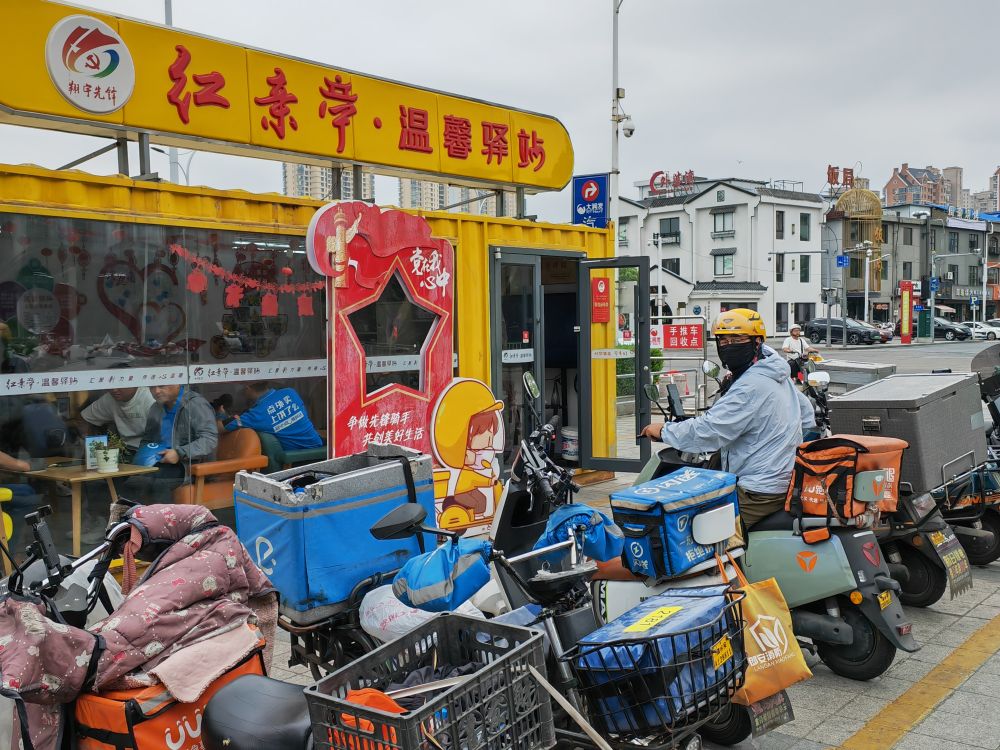 空調(diào)、微波爐、藥箱……記者在江蘇淮安經(jīng)濟(jì)技術(shù)開發(fā)區(qū)大潤(rùn)發(fā)超市旁的溫馨驛站發(fā)現(xiàn),這里空間不大,但功能齊全。不時(shí)有騎手進(jìn)出,在此短暫休息、補(bǔ)水、給手機(jī)充電、閑聊。