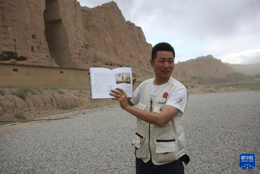 6月15日,在阿富汗巴米揚(yáng)省的巴米揚(yáng)大佛遺址區(qū),中國(guó)學(xué)者邵學(xué)成展示書(shū)中記載的巴米揚(yáng)大佛相關(guān)內(nèi)容。新華社發(fā)(塞夫拉赫曼·薩菲攝)