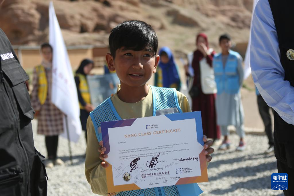 6月16日,在阿富汗巴米揚(yáng)省的巴米揚(yáng)大佛遺址區(qū),參加“馕課”的當(dāng)?shù)貙W(xué)生穆罕默德·扎伊德展示榮譽(yù)證書(shū)。新華社發(fā)(塞夫拉赫曼·薩菲攝)