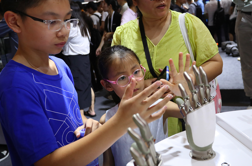 7月5日,在2024世界人工智能大會(huì),小朋友在傲意科技機(jī)器人靈巧手展品旁參觀。新華社記者 方喆 攝