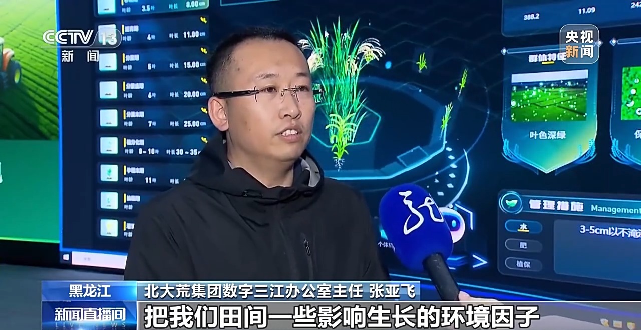 北大荒集團數(shù)字三江辦公室主任 張亞飛:通過無人機群把我們田間的一些影響生長的環(huán)境因子采集回來,然后輸入到我們的大模型之內,采取的手段是空、天、地、人機一體化的感知手段,形成當時、當季需要進行的農事活動的決策指令,通過這個數(shù)字生產(chǎn)模型來指導我們的種植戶更加科學地進行種植,提高水稻單產(chǎn)。