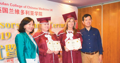 二〇二二年,英國蘭中醫(yī)學院畢業(yè)典禮。左一為湯淑蘭。