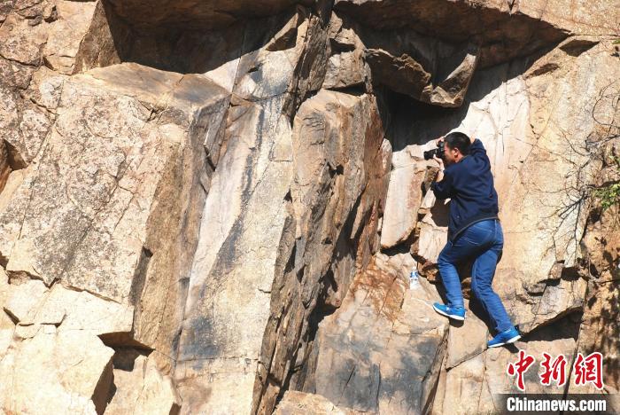 資料圖。圖為2018年,包金泉在科右中旗杜爾基鎮(zhèn)衙門毛杜嘎查境內(nèi),采集畢其格哈達(dá)題記內(nèi)容?!】朴抑衅煳奈锟脊叛芯克﹫D