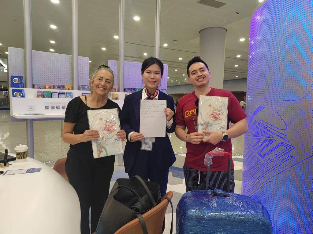 7月3日,在上海浦東機場外籍人員一站式綜合服務中心,兩名南非游客與上海電信工作人員(中)合影。新華社發(fā)