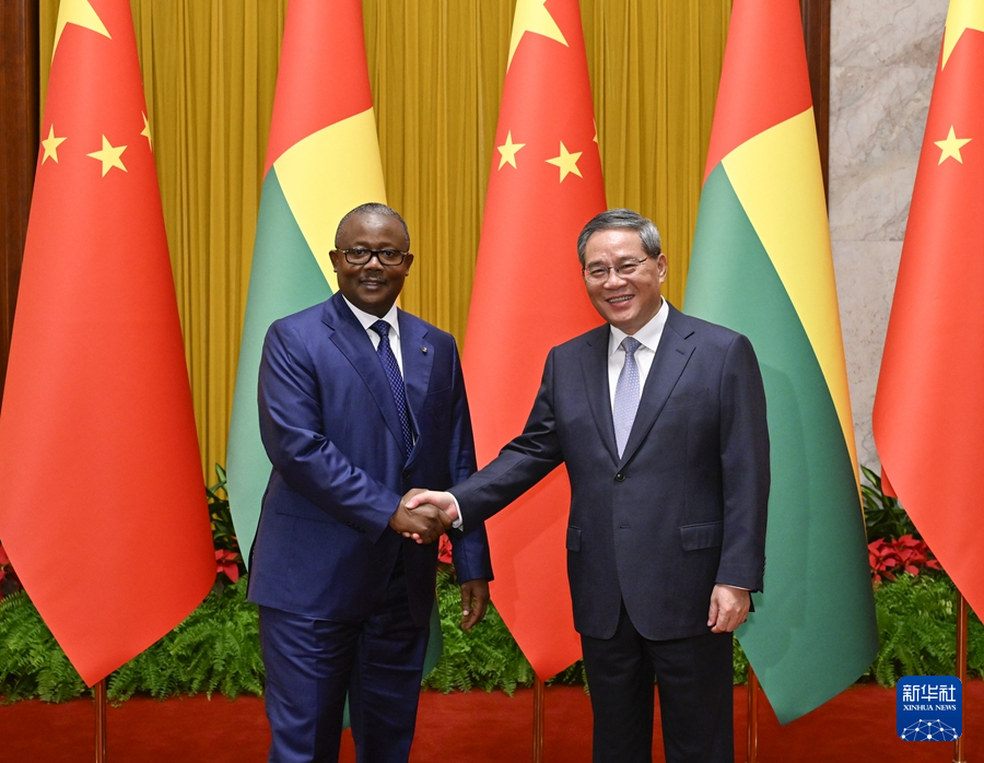 7月10日上午,國務(wù)院總理李強在北京人民大會堂會見來華進行國事訪問的幾內(nèi)亞比紹總統(tǒng)恩巴洛。新華社記者 殷博古 攝
