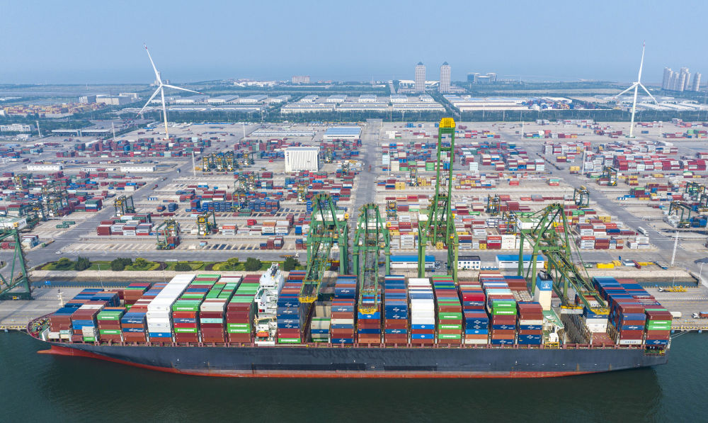7月3日,一艘集裝箱貨輪??吭谔旖蚋厶窖髧H集裝箱碼頭(無人機(jī)照片)。新華社記者 趙子碩 攝