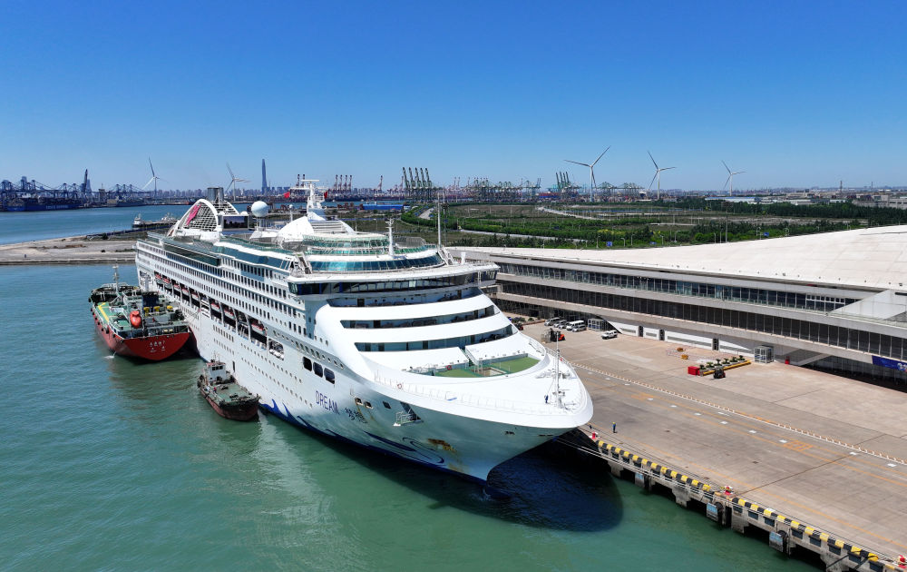 5月15日,“夢想”號郵輪??吭谔旖驀H郵輪母港(無人機(jī)照片)。新華社記者 趙子碩 攝