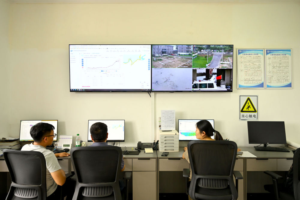 7月14日,王家壩水文站工作人員在監(jiān)測淮河水情。新華社記者黃博涵 攝
