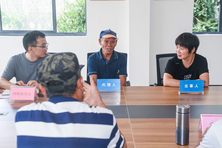 2023年7月26日,在浙江省諸暨市東白湖鎮(zhèn)婁東村新時代文明實踐站的文明共富會客廳內(nèi),網(wǎng)格長召集村里矛盾雙方當事人以及黨員代表、鄉(xiāng)賢代表、人大代表等成員進行宅基地指標糾紛的現(xiàn)場調(diào)解。新華社記者 徐昱 攝