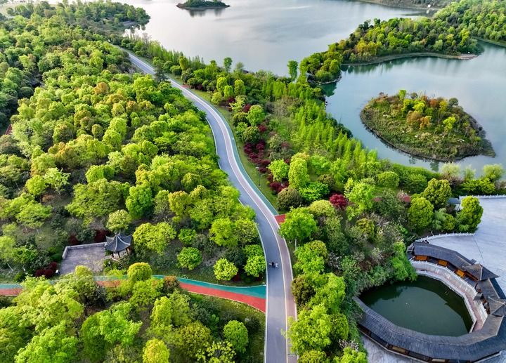 這是2022年4月5日拍攝的江西省萍鄉(xiāng)市萍水湖濕地公園(無人機照片)。萍鄉(xiāng)市將治水與綠化相結(jié)合,沿萍水河打造萍水湖濕地公園。新華社發(fā)(李桂東 攝)