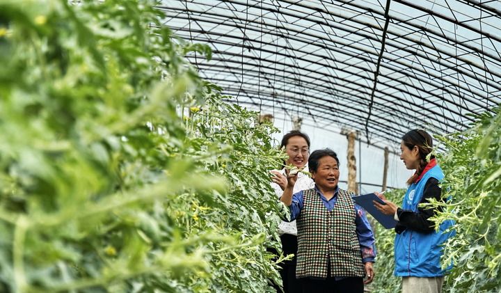 2024年4月9日,北京市大興區(qū)龐各莊鎮(zhèn)李家巷村政務服務站的工作人員來到大棚內(nèi)為瓜農(nóng)辦理社保業(yè)務。新華社記者 李欣 攝