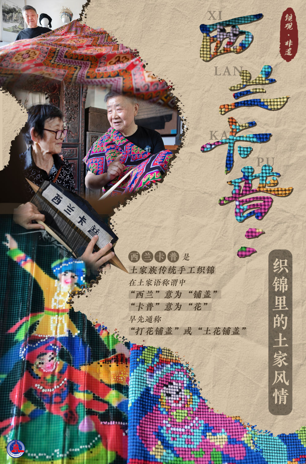 西蘭卡普是土家族傳統(tǒng)手工織錦,在土家語稱謂中,“西蘭”意為鋪蓋,“卡普”意為花,早先通稱“打花鋪蓋”或“土花鋪蓋”。土家孩子出生時(shí)外婆要送織錦,嬰幼兒時(shí)要蓋織錦,女孩子自小學(xué)習(xí)織錦,出嫁時(shí)在織機(jī)上制作西蘭卡普作為陪嫁。西蘭卡普記錄了土家族的風(fēng)俗和情感,與土家人的生活息息相關(guān),被譽(yù)為土家族的“五彩活化石”,2006年被列入國家級非物質(zhì)文化遺產(chǎn)名錄。