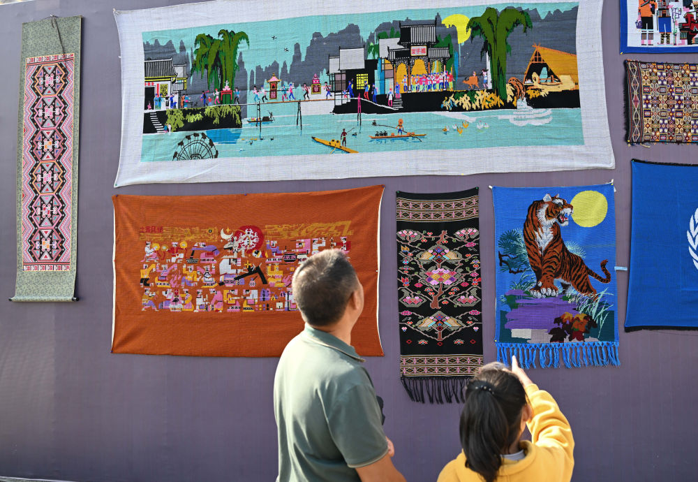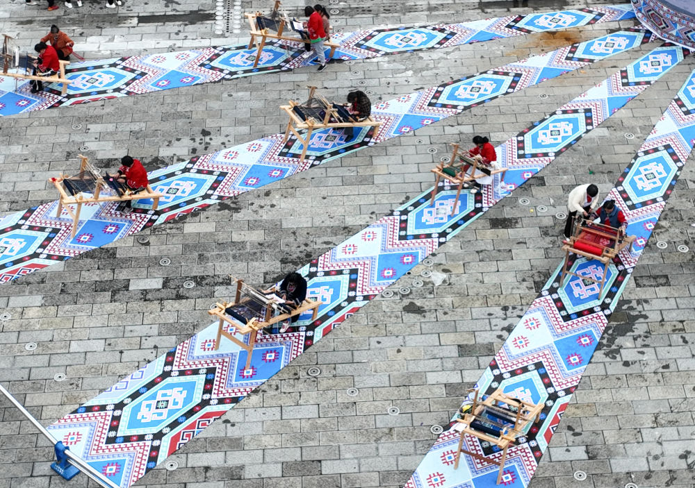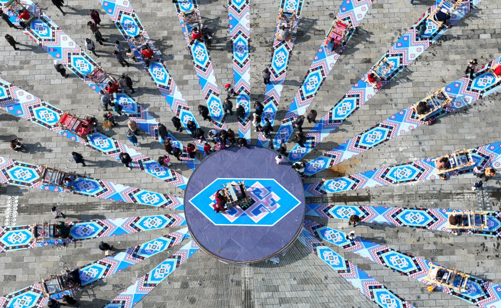 織錦女工在來鳳縣龍鳳文化中心廣場現(xiàn)場制作西蘭卡普,展示非遺技藝(2023年10月28日攝,無人機(jī)照片)。