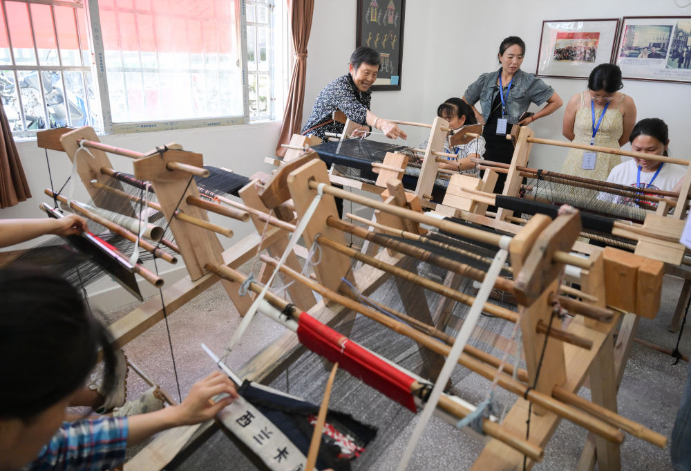 7月2日,唐洪祥的老伴劉秀琴(后左一)指導(dǎo)前來學(xué)藝的學(xué)員們操作織機(jī)。
