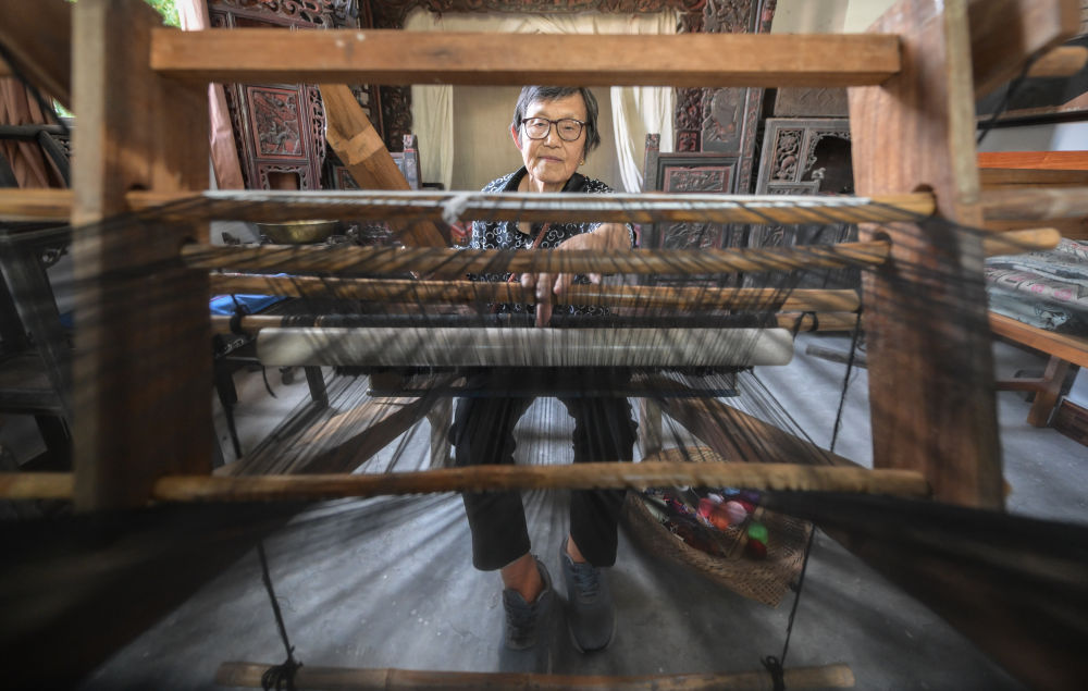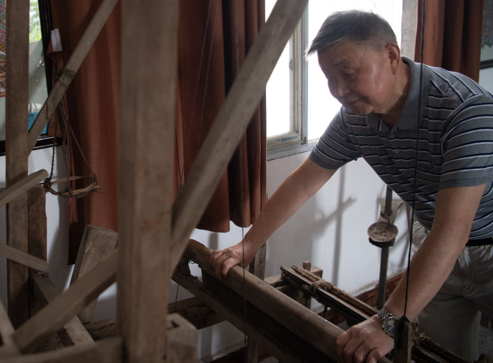 7月3日,唐洪祥檢查織錦博物館里收藏的清代木織機(jī)狀況。