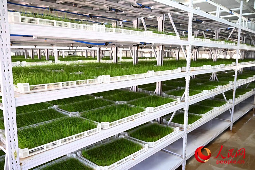 除了飼養(yǎng)蘇尼特羊的棚圈之外,牧場(chǎng)中還設(shè)計(jì)了一座溫室房,里面整齊排列的架子上,種植著郁郁蔥蔥的燕麥草,這里被牧民親切地稱(chēng)為“空中牧場(chǎng)”。