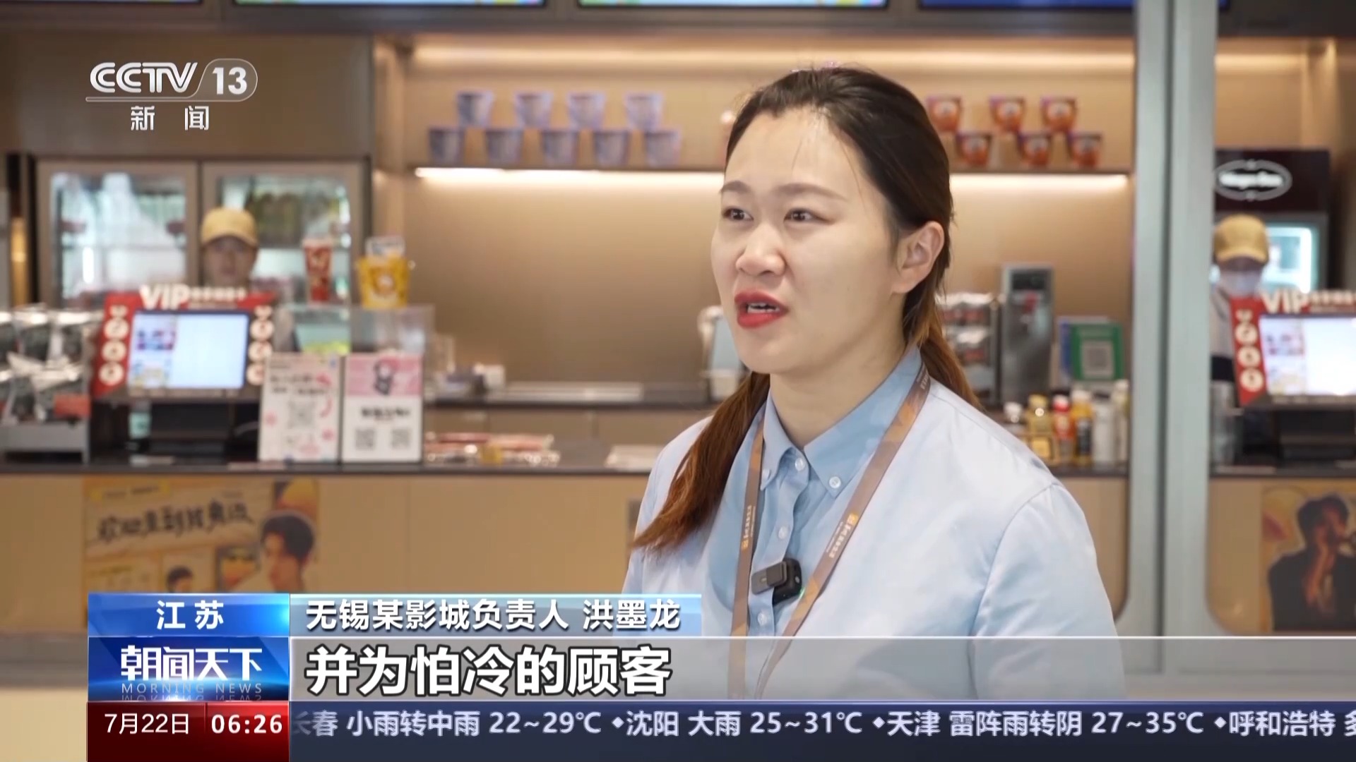 無(wú)錫某影城負(fù)責(zé)人 洪墨龍:首先我們保證影廳的溫度適宜,并為怕冷的顧客提供免費(fèi)干凈的毛毯。我們還會(huì)通過(guò)現(xiàn)場(chǎng)的陳列布置,打造主題觀影氛圍,讓觀眾在觀影過(guò)程中有更多的參與感和互動(dòng)體驗(yàn)。