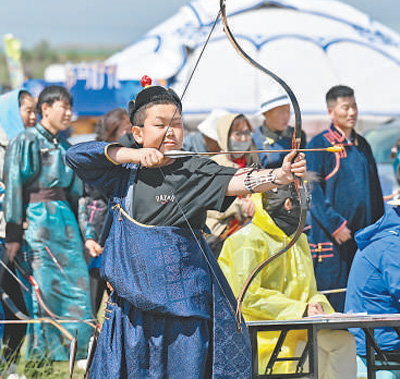 搏克場上,勇士們身姿矯健,近身搏斗;射箭場上,選手們屏息凝神,箭羽破空而出;沙嘎比賽的蒙古包內,孩童們競相投擲,充滿樂趣……遠處,悠揚的馬頭琴聲伴著奶茶醇香,游客們歡聲笑語,沉浸在這場體育盛宴中。