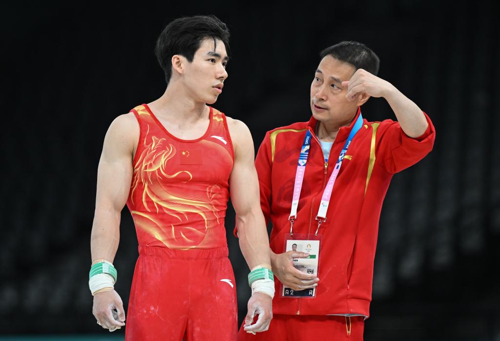 7月24日,中國男子體操隊在巴黎進行賽臺訓(xùn)練,中國隊選手張博恒(左)在準(zhǔn)備吊環(huán)項目訓(xùn)練。新華社記者 程敏 攝