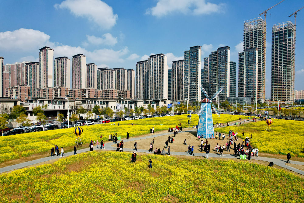 夕陽(yáng)下,只見(jiàn)烏沙河似一條玉帶蜿蜒流淌,岸邊的馬蘭圩濕地公園里,向日葵、波斯菊等鮮花迎風(fēng)綻放。這片200余畝的濕地種植了10多個(gè)品種的鮮花,一年四季花開(kāi)不斷。