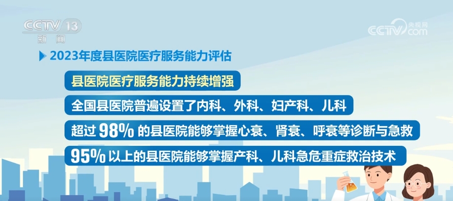 央視網(wǎng)消息:國家衛(wèi)生健康委29日通報了2023年度縣醫(yī)院醫(yī)療服務(wù)能力評估情況,全國共有2062家縣醫(yī)院參與醫(yī)療服務(wù)能力第三方評估,縣域覆蓋率達到98.6%。評估顯示,全國有91.85%的縣醫(yī)院符合基本標(biāo)準(zhǔn),也就是相當(dāng)于達到二級醫(yī)院能力,其中符合推薦標(biāo)準(zhǔn)達到三級醫(yī)院能力的占比超過一半。