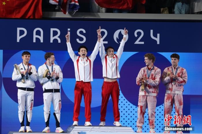 當(dāng)?shù)貢r(shí)間7月29日,在巴黎奧運(yùn)會(huì)跳水男子雙人十米臺決賽中,中國選手練俊杰/楊昊奪得金牌。圖為頒獎(jiǎng)儀式。中新社記者 富田 攝