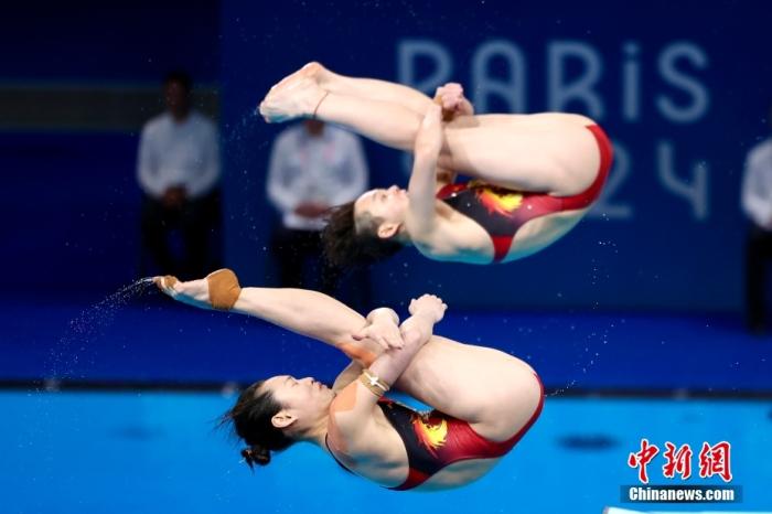 當(dāng)?shù)貢r(shí)間7月27日,中國組合昌雅妮(下)/陳藝文在比賽中。當(dāng)日,在巴黎奧運(yùn)會(huì)跳水女子雙人3米板決賽中,中國組合昌雅妮/陳藝文奪得金牌。 中新社記者 富田 攝