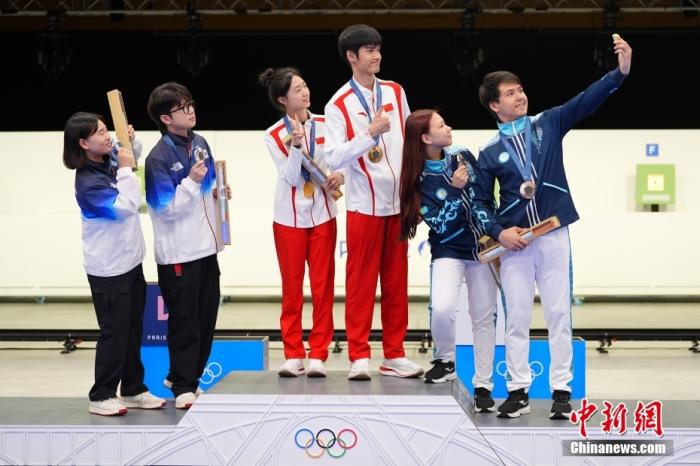 當(dāng)?shù)貢r(shí)間7月27日,在法國沙托魯舉行的巴黎奧運(yùn)會(huì)射擊10米氣步槍混合團(tuán)體決賽中,中國組合黃雨婷/盛李豪奪得金牌。這也是本屆巴黎奧運(yùn)會(huì)誕生的首枚金牌。圖為獲獎(jiǎng)選手在頒獎(jiǎng)儀式上自拍。中新社記者 趙文宇 攝