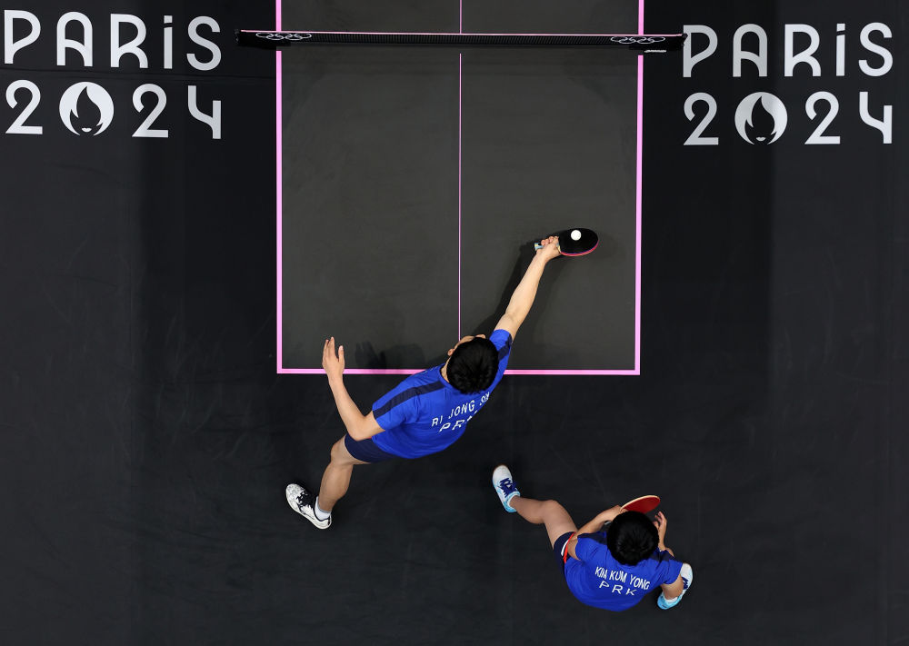 ↑7月30日,朝鮮組合李正植(左)/金琴英在比賽中。新華社記者郭昱攝