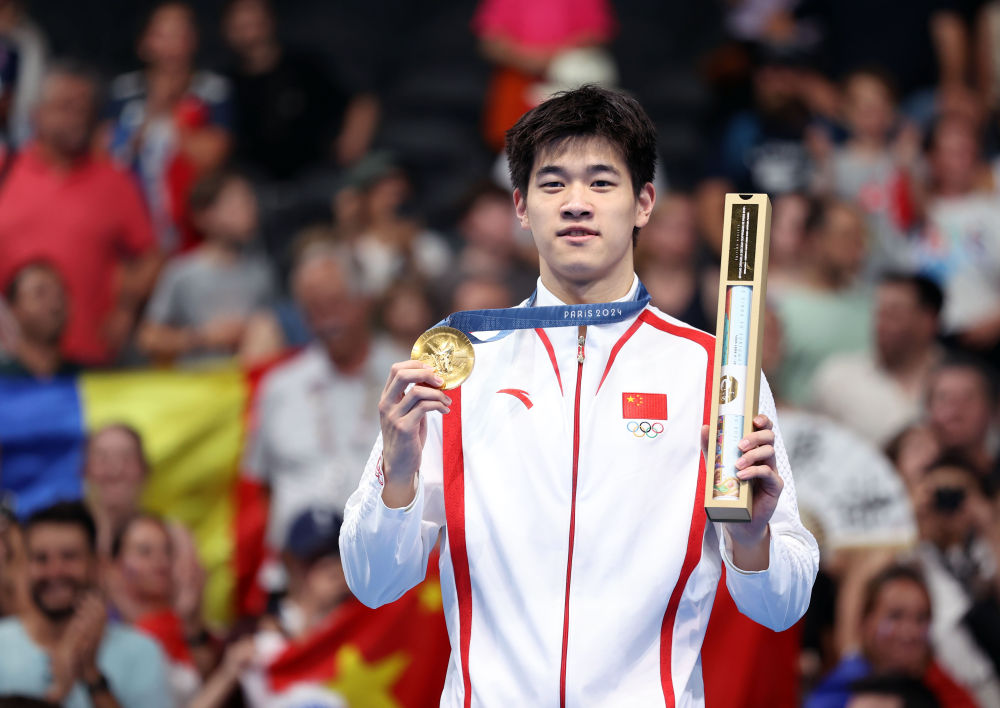 ↑中國(guó)選手潘展樂(lè)在頒獎(jiǎng)儀式上。新華社記者 杜宇 攝