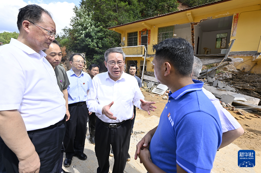 8月1日,中共中央政治局常委、國務院總理李強在湖南郴州看望慰問受災群眾,檢查指導防汛工作。這是李強在資興市州門司鎮(zhèn)燕窩村實地察看災情,走訪受災村民。新華社記者 岳月偉 攝