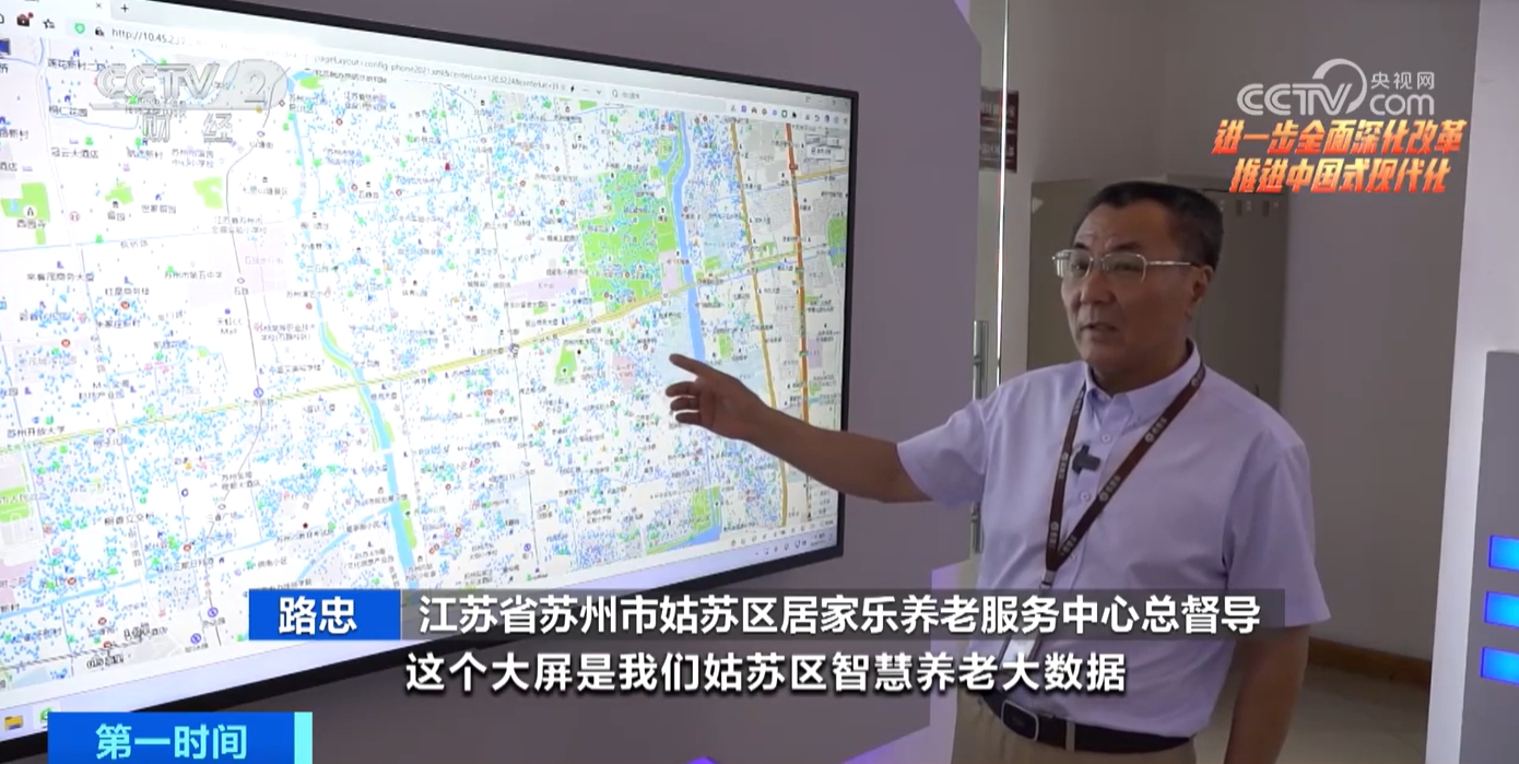 江蘇蘇州姑蘇區(qū)居家樂養(yǎng)老服務(wù)中心總督導(dǎo)路忠介紹,這個大屏是姑蘇區(qū)智慧養(yǎng)老大數(shù)據(jù)在線實(shí)時的數(shù)字地圖,粉色的點(diǎn)就是現(xiàn)在正在服務(wù)中的284戶老人,綠色的點(diǎn)位就是現(xiàn)在還有900多個老人在等待著上門服務(wù),大量的藍(lán)色的小點(diǎn)是服務(wù)用戶,是整個“虛擬養(yǎng)老院”的老人。