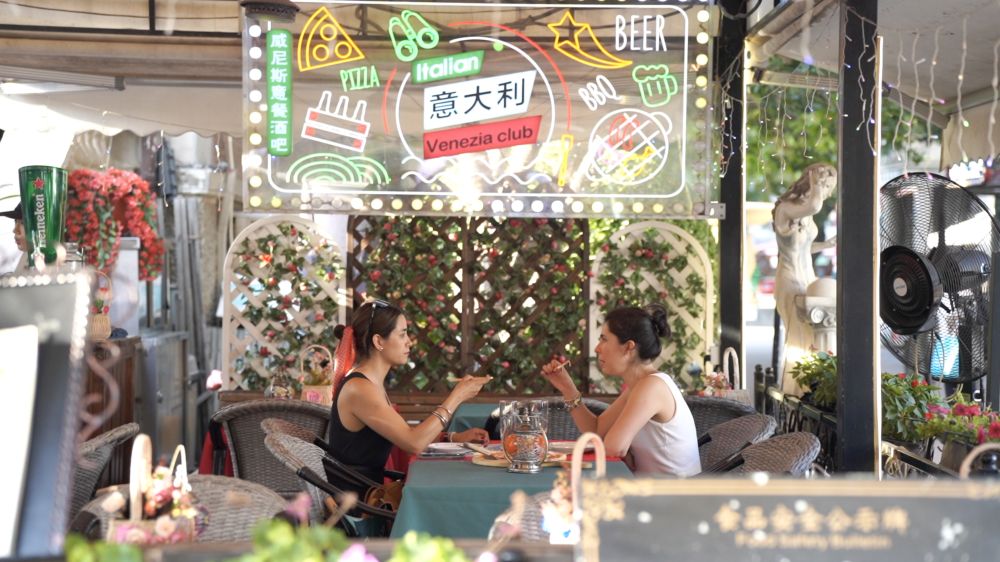 意式風(fēng)情區(qū)核心區(qū)是由五經(jīng)路、博愛道、勝利路、建國道合圍而成的四方形地區(qū)。走進(jìn)這一片街區(qū),不經(jīng)意間有種穿越到意大利的錯(cuò)覺。近期,意式風(fēng)情區(qū)的“洋面孔”也多了起來。他們有的閑坐戶外,品嘗風(fēng)味獨(dú)到的美酒佳肴;有的進(jìn)行“特種兵式”拍照打卡,記錄這場(chǎng)獨(dú)特的中國之旅……