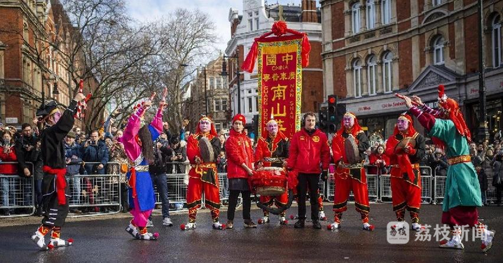當(dāng)?shù)貢r間 2024 年 2 月 11 日,陳來發(fā)教練率領(lǐng)廣東普寧南山英歌隊(duì)的近 20 名舞者現(xiàn)身英國倫敦,揭開了當(dāng)?shù)匦麓簯c典的帷幕,這也是普寧英歌首次出海。與此同時,千里之外的普寧市內(nèi)另有一支南山英歌隊(duì)伍正穿梭于街巷,為市民驅(qū)邪扶正,帶隊(duì)者之一正是陳揚(yáng)波。
