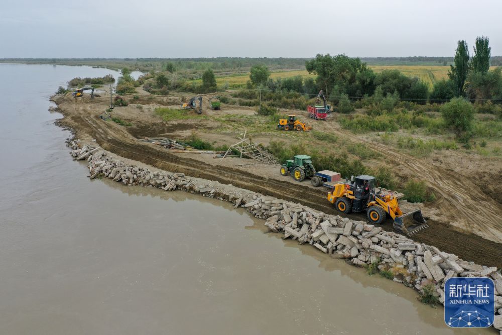↑在新疆阿克蘇地區(qū)沙雅縣蓋孜庫木鄉(xiāng)吐央村,搶險人員駕駛大型機械進行堤壩加固(8月3日攝)。