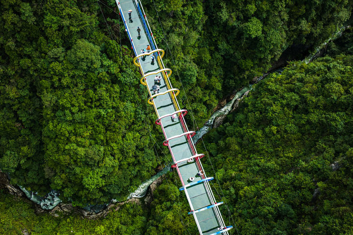 2023年8月20日,游客在湖北省恩施州建始縣地心谷景區(qū)游玩(無人機照片)。新華社記者 肖藝九 攝