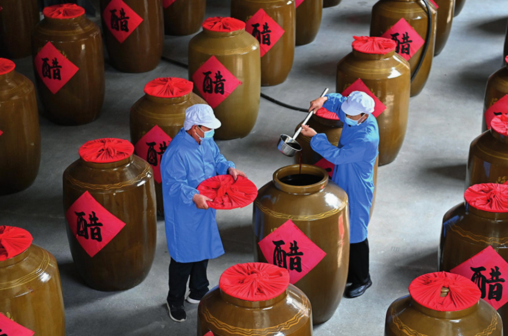 工作人員在山西省長治市平順縣龍溪鎮(zhèn)龍鎮(zhèn)村農(nóng)旅產(chǎn)業(yè)融合發(fā)展示范園內(nèi)查看醋的成色(2024年5月10日攝) 楊晨光攝/《瞭望》