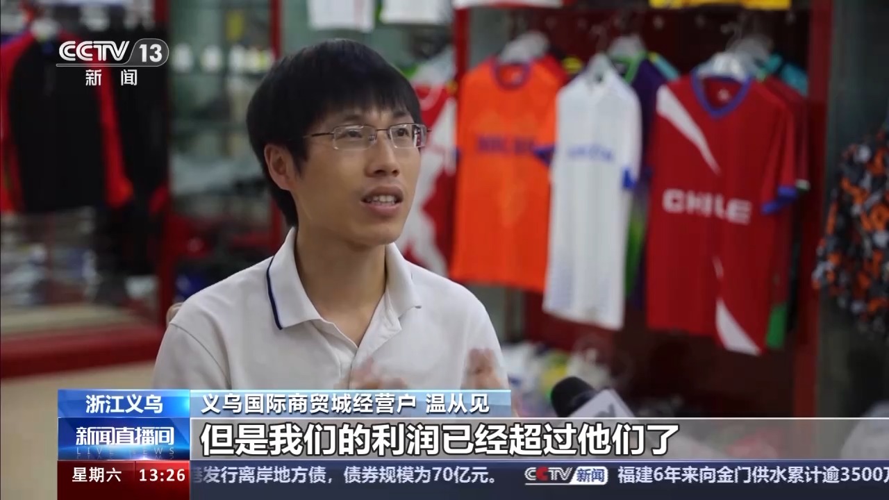 溫從見(jiàn)是義烏國(guó)際商貿(mào)城的一位經(jīng)營(yíng)戶(hù),從事球衣服裝行業(yè)已經(jīng)17年,經(jīng)歷了多輪體育賽事的備貨、生產(chǎn)和銷(xiāo)售。得益于敏銳的反應(yīng)力和良好的適應(yīng)力,溫從見(jiàn)在今年大賽期間收益頗豐。