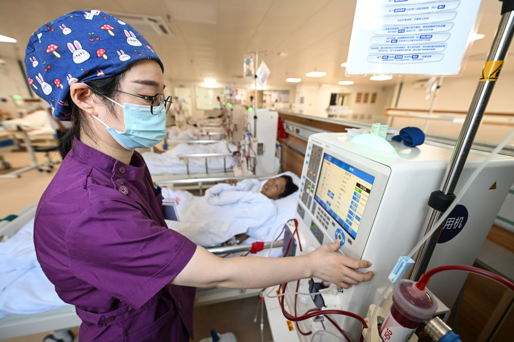 江蘇海安市曲塘中心衛(wèi)生院護士在血液透析中心操作設備(2024年7月31日攝)。海安加快優(yōu)質(zhì)醫(yī)療資源下沉,對基層醫(yī)療機構管理、技術等方面進行幫扶。數(shù)據(jù)顯示,2023年海安市縣域內(nèi)就診率為90.54%,基層醫(yī)療衛(wèi)生機構門急診占比為74.86%。新華社記者 季春鵬 攝