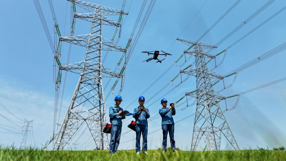 面對安徽、江蘇持續(xù)高溫,皖蘇兩省的電力工人聯(lián)合對省際聯(lián)絡線及相關配電設施進行檢修,并開展輸變電設施巡視檢查。這是在安徽省滁州市南譙區(qū),電力工人運用無人機對500千伏輸電線路進行巡視檢查(2024年8月9日攝)。新華社記者 曹力 攝