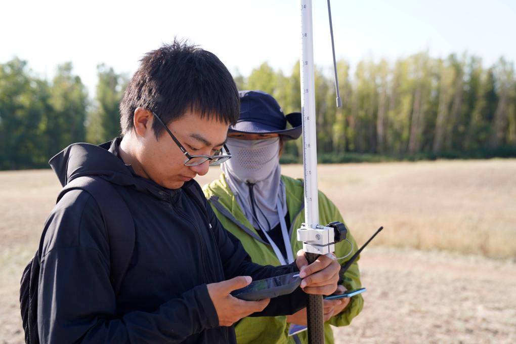 尼勒克縣第四次全國文物普查工作隊隊員魏中暢(左一)手持RTK測量儀,復核文物信息。新華社記者 白志強 攝