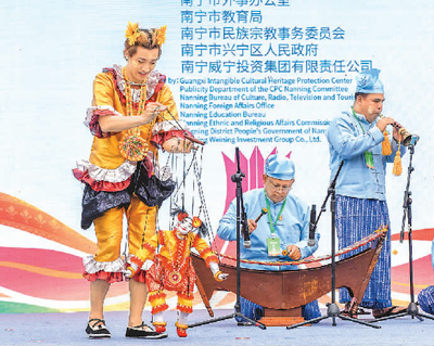四月十二日,在第二屆中國—東盟(南寧)非物質(zhì)文化遺產(chǎn)周上,演員們進(jìn)行非遺展演。彭寰攝(人民圖片)
