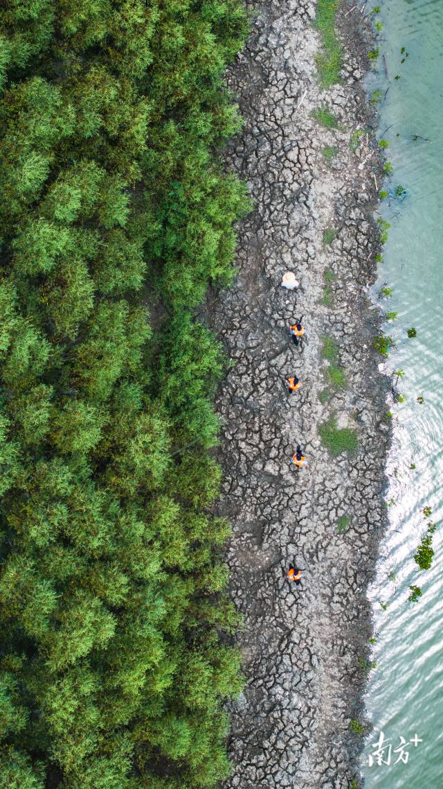 說話間,大家伙各就各位、有序分工,拍照的拍照、記錄的記錄?!皹鋵殞殹迸浜系嘏排帕⒄?,在風(fēng)中“搖頭晃腦”。此時(shí),“技術(shù)控”李明霖飛起一架無人機(jī),從高空拍下“大合影”和視頻,解釋道:“后續(xù)還要比對(duì)片區(qū)紅樹林總體長勢(shì)變化?!?/strong>