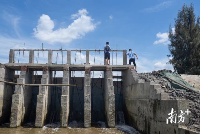 楊健宏與李明霖爬上水閘,查看紅樹林復(fù)種情況。