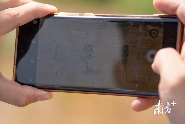 李明霖用手機(jī)拍下剛復(fù)種不久的“樹寶寶”。通過不同時(shí)間的影像對(duì)比,他們可以監(jiān)測(cè)紅樹林總體長勢(shì)。