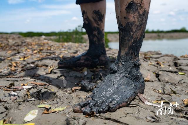 1個(gè)多月過去,補(bǔ)種的“樹寶寶”該做“體檢”了。日頭漸猛,潮漲起來了?!懊撔忂^去!”聽著楊健宏的招呼,大家一腳踏進(jìn)泥地,一步一個(gè)腳印,泥土很快爬滿了小腿。