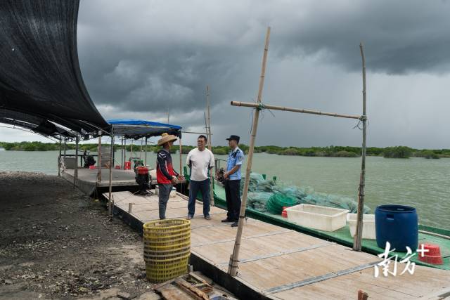 暴雨前夕,楊健宏正與保護(hù)區(qū)管理局工作人員向魚塘主科普紅樹林保護(hù)知識(shí)。