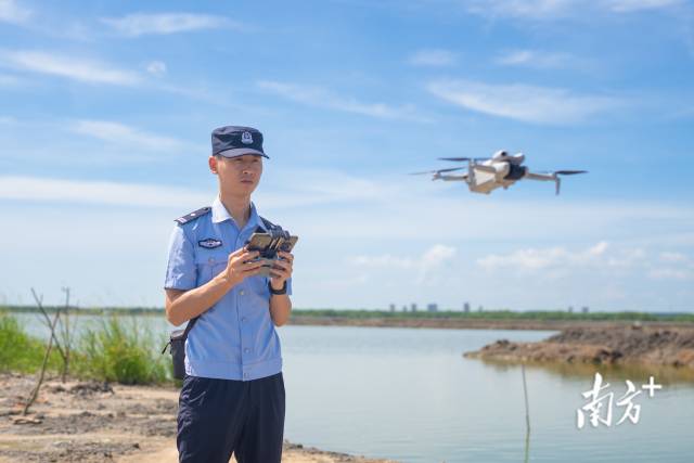 李明霖用無人機(jī)航拍紅樹林,觀察記錄保護(hù)情況。